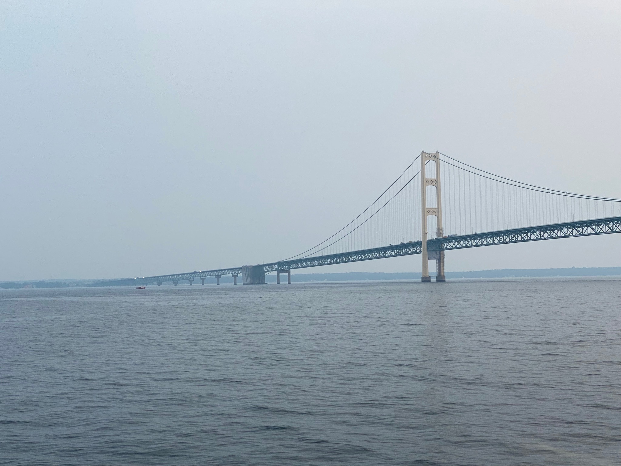 The Mackinac Bridge The Mackinac Bridge is a suspension bridge spanning the Straits of Mackinac to connect the Upper and Lower peninsulas of the U.S. state of Michigan. Opened in 1957, the 5 mile long bridge is the world's 24th-longest main span.